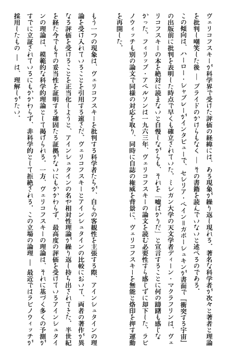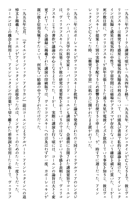 私はヴェリコフスキーの著作、いやその論文(本書簡と共に返却する)すら研究する資格も時間も持ち合わせていない。しかし現代科学に教条主義はなく、そして時間相対性や素粒子世界における厳密な因果関係の不在といった革命的新説を容易に受け入れる姿勢は承知している ─ だから、有能な天体物理学者たちがヴェリコフスキーの理論について偏見のない判断を下すことを信頼している。そして私の知る限り、有能な科学者で[それら]を支持する声を上げた者は一人もいない(たとえ君とプリンストン大学の同僚の一人が『サイエンス』誌でヴェリコフスキーの特定の結論の驚くべき正確さを指摘する義務を感じたとしても)」